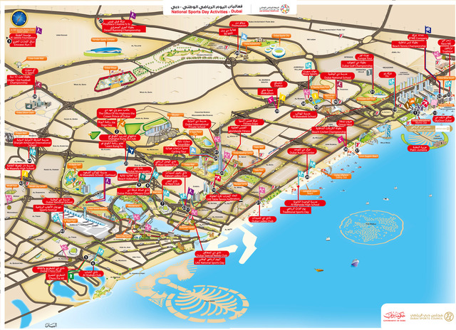 حيث ينظم كل من نادي النصر الرياضي، نادي الوصل الرياضي، نادي الشباب العربي، نادي دبي الثقافي الرياضي، نادي حتا، نادي دبي للمعاقين، ونادي دبي للسيدات، العديد من الأنشطة الرياضية المتنوعة بمقر كل ناد تستمر من الساعة العاشرة صباحاً حتى الساعة السابعة مساءً، فيما ينظم نادي دبي الدولي للرياضات البحرية بطولة للدراجات المائية الاستعراض الحر بمقر النادي في الساعة الثالثة والنصف مساءً، وينظم نادي دبي للشطرنج بطولة الشطرنج للجميع حيث تقام عدة مسابقات في الشطرنج بمقر نادي دبي الدولي للرياضات البحرية بالميناء السياحي وذلك من الساعة الخامسة حتى الثامنة مساءً، و ينظم نادي زعبيل للسيدات سباق الجري للسيدات في الساعة التاسعة صباحاً بمضمار الجري الموجود بمقر النادي، وسينظم نادي «داش» مسيرة مشي في مضمار حديقة القرآن الكريم بمنطقة الخوانيج في الساعة الرابعة عصراً، وسيقيم نادي سكاي دايف عروضاً جوية مختلفة بمقر النادي بدبي مارينا في الرابعة مساءً.