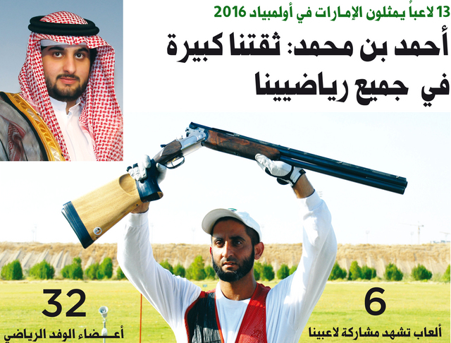 من جانبه، أكد المستشار أحمد الكمالي نائب رئيس اللجنة الفنية في «الأولمبية»، رئيس اتحاد ألعاب القوى، أن هذه المشاركة الأكبر في تاريخ دولة الإمارات، من خلال 13 لاعباً ولاعبة، وقال إن لاعبي الرماية تدربوا بشكل جيد، ويعتبر الشيخ سعيد بن مكتوم بن راشد آل مكتوم من أصحاب الخبرات الكبيرة في المشاركة الأولمبية، إلى جانب خالد الكعبي الموهوب في اللعبة، وزميله سيف بن فطيس بطل العالم وصاحب الميداليات الملونة العالمية، مشيراً إلى أن الجودو تبدو جيدة، كونهم يمتلكون لاعبين محترفين من الطراز الأول.