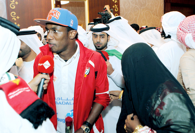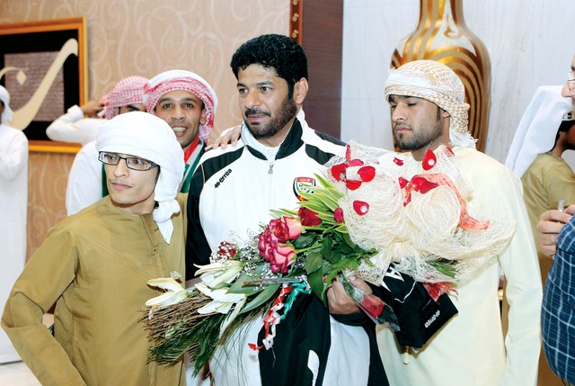 وحرص سمو الشيخ ماجد بن محمد وسمو الشيخ منصور بن محمد، على استقبال الأبطال عند باب الطائرة الخاصة، التي أقلتهم من طشقند إلى المطار الأميري في مطار دبي الدولي، حيث حطت الطائرة عجلاتها على المدرج في تمام الثانية فجراً، وتقدم يوسف السركال أعضاء البعثة لحظة الخروج من الطائرة، حيث صافحه سمو الشيوخ بحرارة مهنئين على الفوز والإنجاز التاريخي، الذي جاء بفضل التخطيط السليم وتوفير كل عوامل النجاح أمام الجهازين الفني والإداري واللاعبين، ثم خرج أعضاء الجهازين الفني والإداري وصافحهم المستقبلون بحرارة تواكب الإنجاز، وقدم المستقبلون التهنئة الحارة إلى اللاعبين الذين بدت عليهم الفرحة بالفوز وتحقيق الإنجاز.