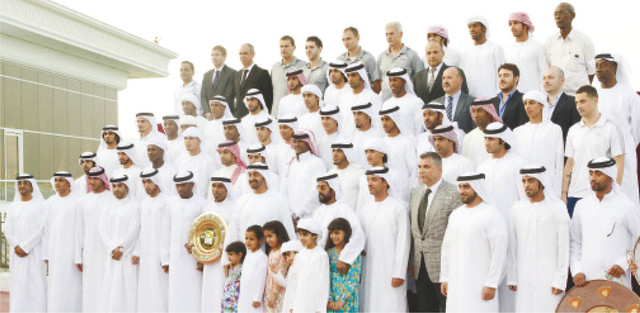وأشاد سموه بدور الرعاة الداعمين للأندية الرياضية والمؤسسات الشبابية إلى جانب إسهام المؤسسات الإعلامية وخاصة الإعلام الرياضي والذي كان لتفاعلهم ودعمهم الفعاليات الأثر الكبير في تقدم الحركة الرياضية في دولة الإمارات واصفا سموه إياهم بانهم شركاء مسيرة النجاح والتفوق. وفي ختام اللقاء أهدى اللاعبون درع بطولة دوري المحترفين إلى سموه تقديرا وعرفانا لدعم سموه اللامحدود للرياضة والرياضيين. وتم التقاط الصور التذكارية مع سموه.