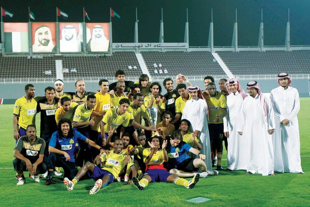 توج فريق النصر السعودي بطلاً لدورة الوحدة الدولية الودية الأولى لكرة القدم، والتي اختتمت فعالياتها مساء أول من أمس على ستاد آل نهيان، بعد تعادل الفريق السعودي مع الرفاع البحريني في الجولة الثالثة والأخيرة من البطولة بهدف لكل منهما. وتوج عبد الله ناصر الجنيبي رئيس مجلس إدارة شركة الوحدة لكرة القدم نادي النصر، بكأس البطولة والميداليات الذهبية عقب انتهاء المباراة الأولى بعد أن ضمن الفريق اللقب.