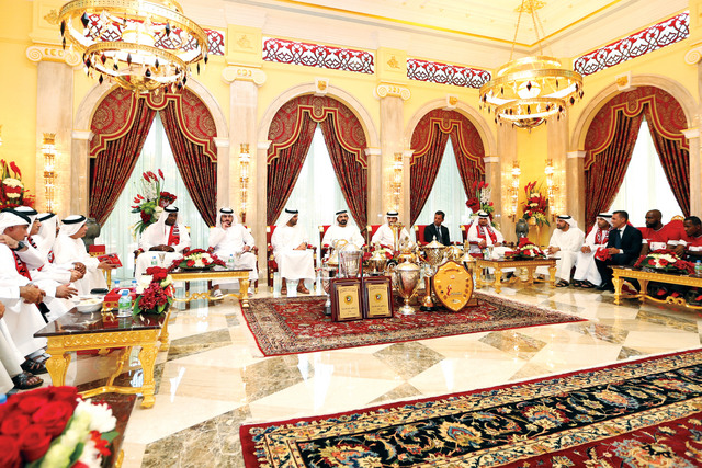 عاش الأهلي أجواء احتفالية أخرى أمس، بعد حفاوة الاستقبال الذي حظيت به أسرة النادي من قبل صاحب السمو الشيخ محمد بن راشد آل مكتوم نائب رئيس الدولة رئيس مجلس الوزراء حاكم دبي، رعاه الله، عندما استقبلهم سموه في قصره بزعبيل مساء أمس الأول، بحضور سمو الشيخ حمدان بن محمد بن راشد آل مكتوم ولي عهد دبي رئيس مجلس دبي الرياضي رئيس النادي الأهلي.