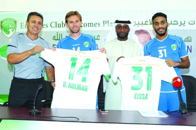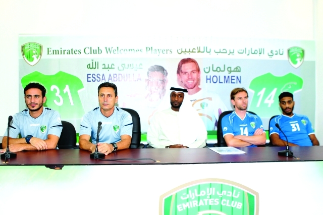 عقد نادي الإمارات مؤتمراً صحفياً مساء أول من أمس، بحضور البرازيلي باولو كاميلي المدير الفني للفريق وخليفة باروت مدير الفريق الأول لكرة القدم، واللاعبين الجدد الأسترالي هولمان وعيسى عبد الله، وأكد خلاله خالد النقبي المنسق الإعلامي للنادي، أن الهدف من المؤتمر توضيح استعدادات الصقور للموسم الجديد والترتيبات الإدارية والفنية، وتقديم الوافدين الجدد هولمان وعيسى، وكذلك الكشف عن أهداف الفريق، وتم التأكيد خلال المؤتمر على حسم ملف التعاقدات مع لاعبين أجانب ولاعب مواطن خلال الأيام المقبلة، مع وضع المركز السادس هدفا للفريق في دوري الخليج العربي هذا الموسم.