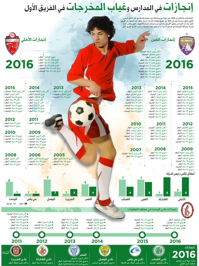 موسم 2016 يعد من أفضل المواسم التي مرت على ناديي الأهلي والعين في بطولات المراحل السنية، حيث تبادلا منصات التتويج فيها، ما عدا بطولة تحت 21 سنة التي ذهبت لفريق الشارقة، وبطولة تحت 19 سنة التي ذهبت لفريق الوحدة، وهي مفارقة عجيبة توضح أن العين والأهلي يركزان على بطولات تحت 17 سنة فما دون، فيما يكون تميز الشارقة والوحدة والجزيرة على بطولات فوق سن 17 سنة، وهو الأمر الذي يؤكد أن مخرجات الأندية الثلاث الجزيرة والوحدة والشارقة هي الأفضل على مستوى الفريق الأول.
