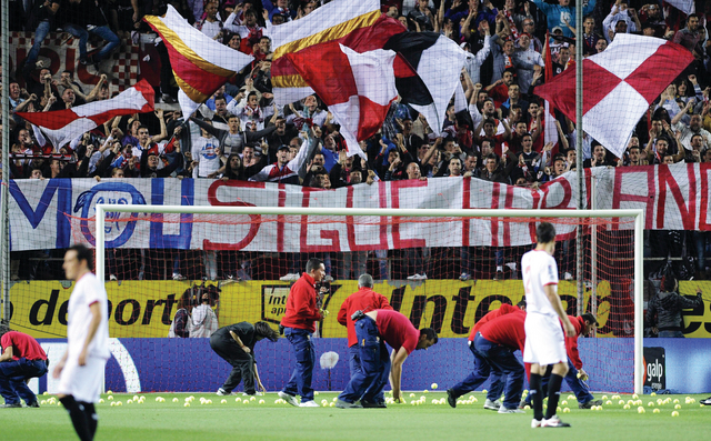 توقفت مباراة اشبيلية مع ضيفه ليفانتي في دوري الدرجة الأولى الاسباني لكرة القدم فترة قصيرة بعدما ألقت جماهير بكرات تنس على أرض الملعب بسبب موعد بداية اللقاء.