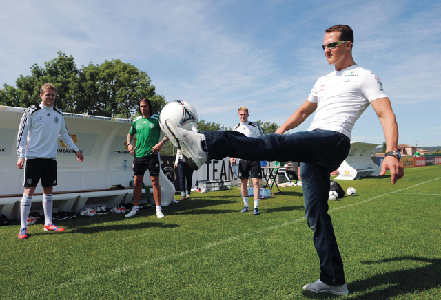 . واستعرض شوماخر مهاراته في كرة القدم وسط تصفيق لاعبي المنتخب الألماني في أجواء مرحة ملؤها التفاؤل والحماس.