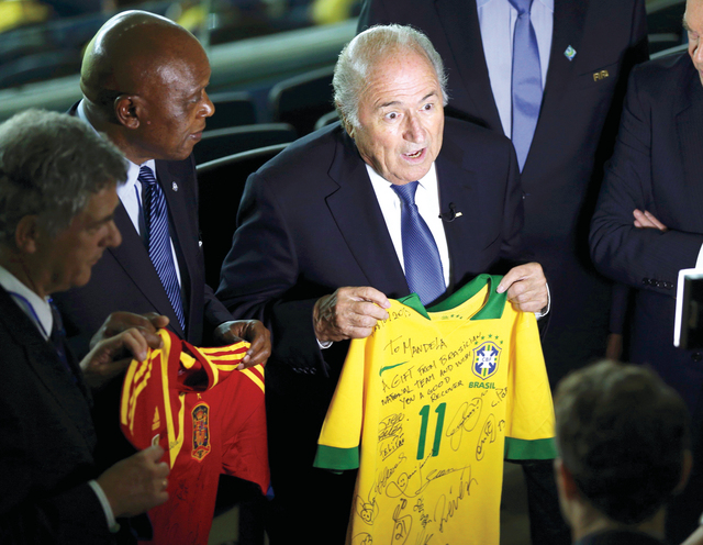 وأحاط ببلاتر رئيس الاتحاد الإسباني لكرة القدم أنخل ماريا فيلار لونا ورئيس الاتحاد البرازيلي لكرة القدم خوسيه ماريا مارين.