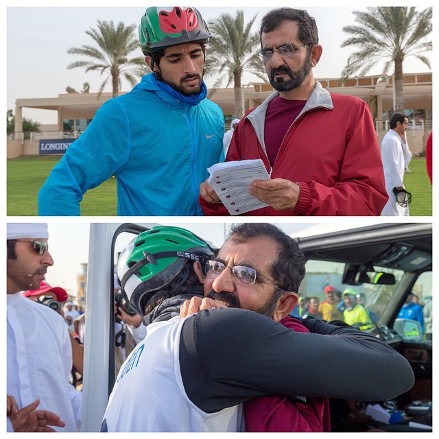 ويظهر في الصورة صاحب السمو الشيخ محمد بن راشد وهو يحتضن سمو الشيخ حمدان وذلك بعد فوزه بكأس صاحب السمو الشيخ محمد بن راشد آل مكتوم للقدرة لمسافة 160 كلم.