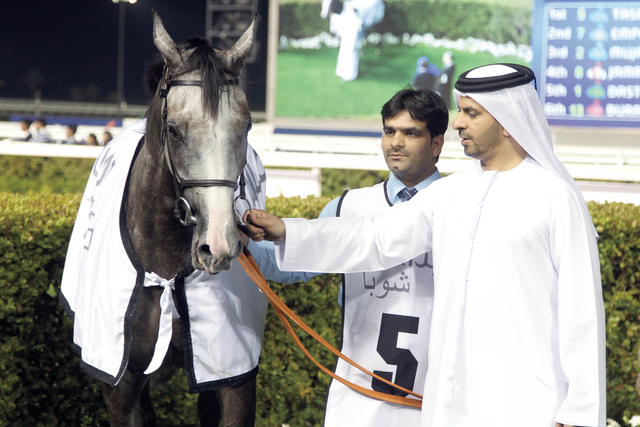 وفي ختام الشوط، قام محمد الشحي عضو مجلس إدارة هيئة الإمارات لسباق الخيل بتتويج الأبطال الفائزين.