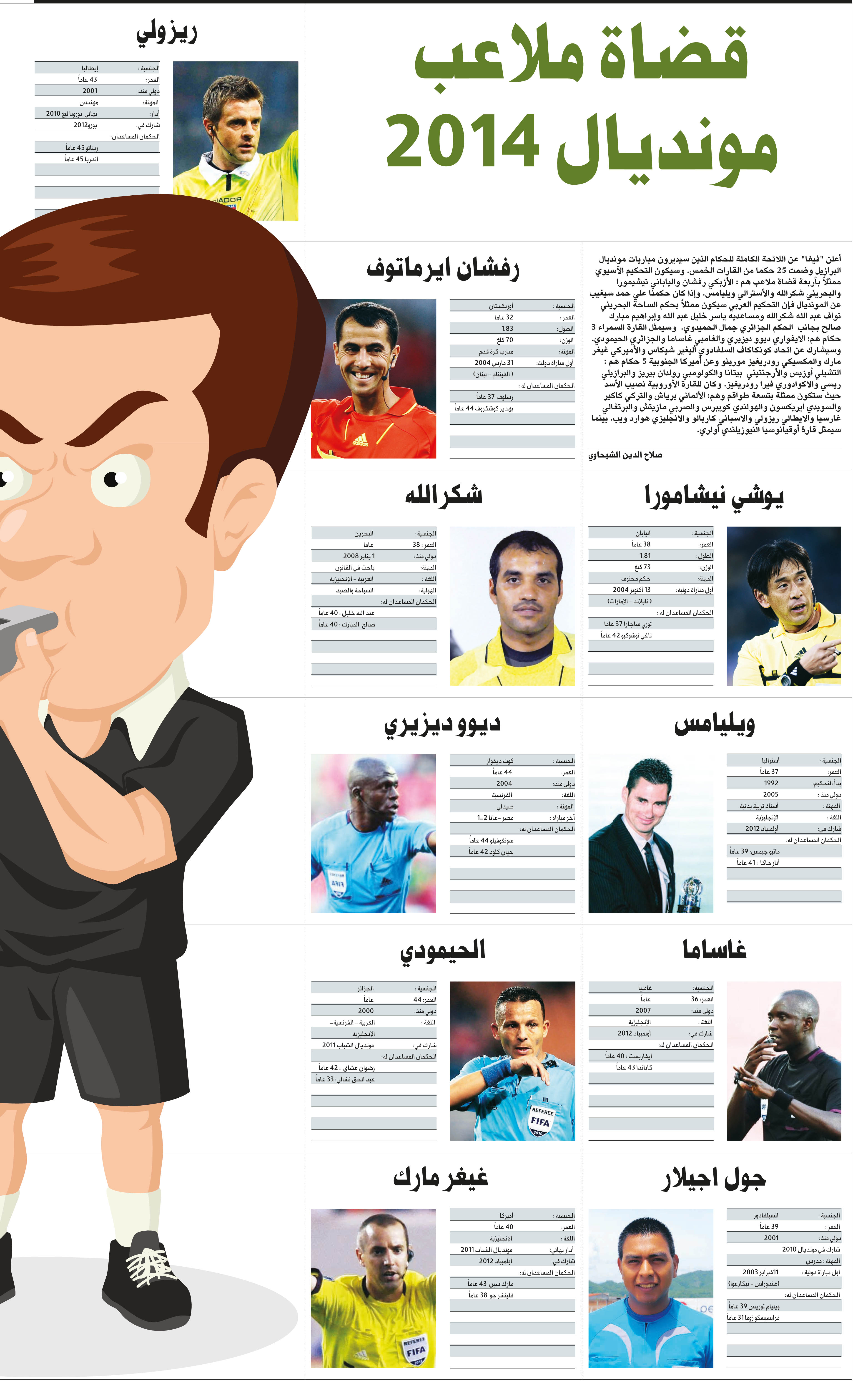 أعلن "فيفا" عن اللائحة الكاملة للحكام الذين سيديرون مباريات مونديال البرازيل وضمت 25 حكما من القارات الخمس. وسيكون التحكيم الآسيوي ممثلاً بأربعة قضاة ملاعب هم : الأزبكي رفشان والياباني نيشيمورا والبحريني شكرالله والأسترالي ويليامس. وإذا كان حكمنا علي حمد سيغيب عن المونديال فإن التحكيم العربي سيكون ممثلاً بحكم الساحة البحريني نواف عبد الله شكرالله ومساعديه ياسر خليل عبد الله .