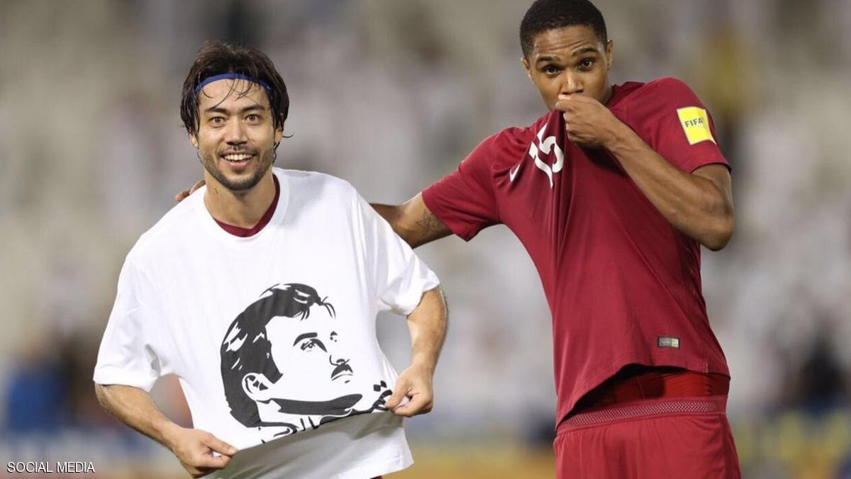 وتظهر الصورة المرفقة بالخبر بدرو ميغيل لاعب قطر رقم 15، مجنس من أصل برتغالي، يقبل قميصه بينما يقف بجانبه لاعب آخر ذو ملامح أسيوية يرتدي "قميص تميم".