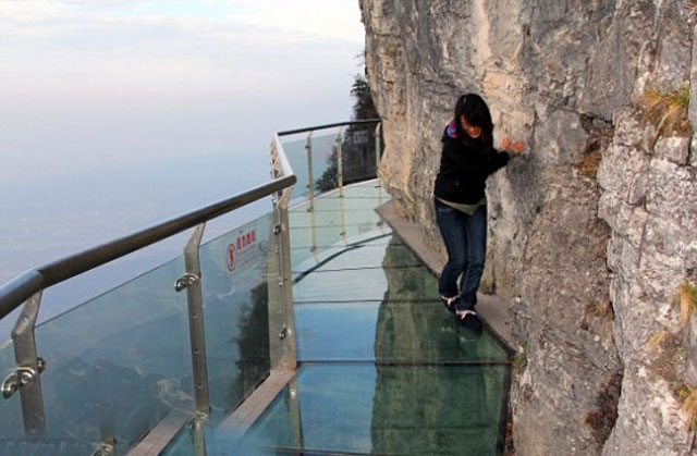 لا شك في أن هذا الجسر ليس لضعيفي القلوب فهو جسر معلق عرضه أقل من متر واحد، أحد جانبيه منحدر صخري والجانب الأخر حاجز زجاجي لا يزيد ارتفاعه عن المتر ونيف يفصلك عن ارتفاع يزيد عن 1220 مترا، ولكن أكثر ما يبعث على الخوف في هذا الجسر هو أنه مصنوع من الزجاج ويسمح لك بالرؤية تحت قدميك أثناء عبوره.