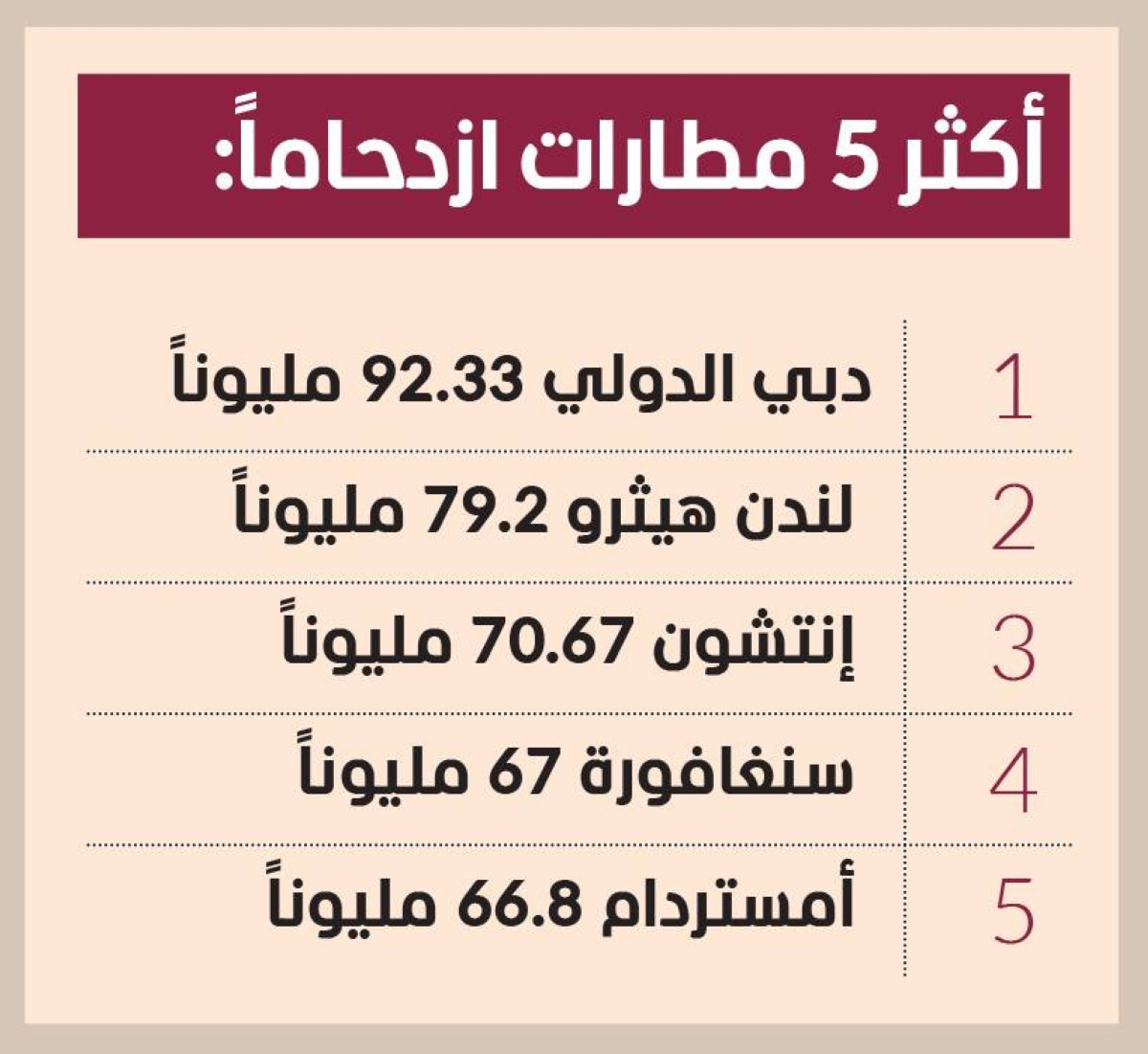 وجاء مطار دبي الدولي في المركز الأول في حركة المسافرين الدوليين بـ 92.33 مليون مسافر، يليه «لندن هيثرو» 79.2 مليون مسافر، ومطار «إنتشون» الكوري الجنوبي ثالثاً بـ 70.67 مليون مسافر، ثم مطار سنغافورة 67 مليون مسافر، وأمستردام بـ 66.8 مليون مسافر.