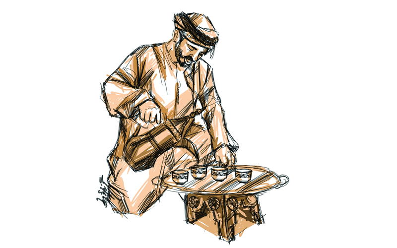 ويضيف بن طروق: «بعد تقديم القهوة للضيف، يسأل كبير القوم أو أكبرهم سناً عن أحوال الضيف، ويقول له «علومكم» ومنها يطلع عن أخباره ويكشف الغطاء عن أسباب الزيارة، فمن الممكن أن يكون مضيع طريقه، ومنها يوفر له الحماية والإكرام». ويشير بن طروق أن القهوة عند أهل البدو تعتبر من أساسيات الحياة، فيتم إعداد القهوة في ساعات الفجر الأولى، ويقول إنه من المستحيل أن يتناول التمر من دون وجود القهوة، مشيراً إلى أن القهوة العربية في السابق كانت تحتوي على البن والهال، وبعدها تم إضافة الزعفران وماء الورد وغيرها.