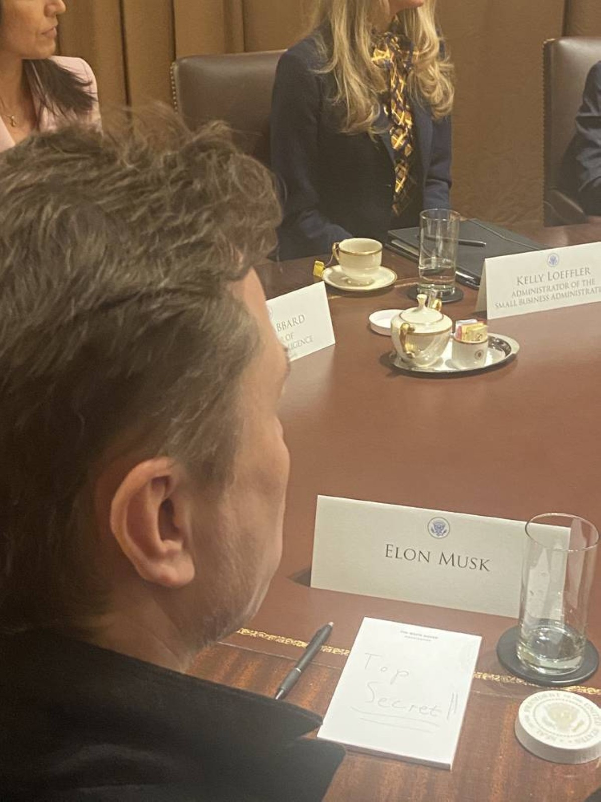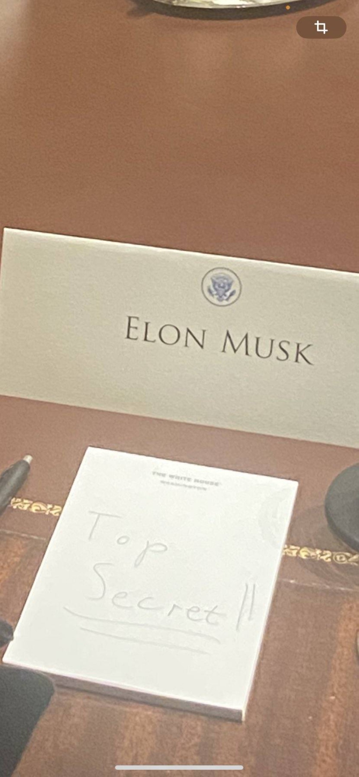 وكانت الرسالة مكتوبة بخط اليد على مفكرة، وُجدت أمام إيلون ماسك خلال اجتماع حكومي متلفز لإدارة ترامب، تُظهر الصور المنشورة على مواقع التواصل الاجتماعي المؤسس المشارك لشركة تيسلا جالسًا حول طاولة مع كبار أعضاء حكومة الرئيس الأمريكي دونالد ترامب ، مع كتابة غامضة "سري للغاية" أمامه وأمام الكاميرات.