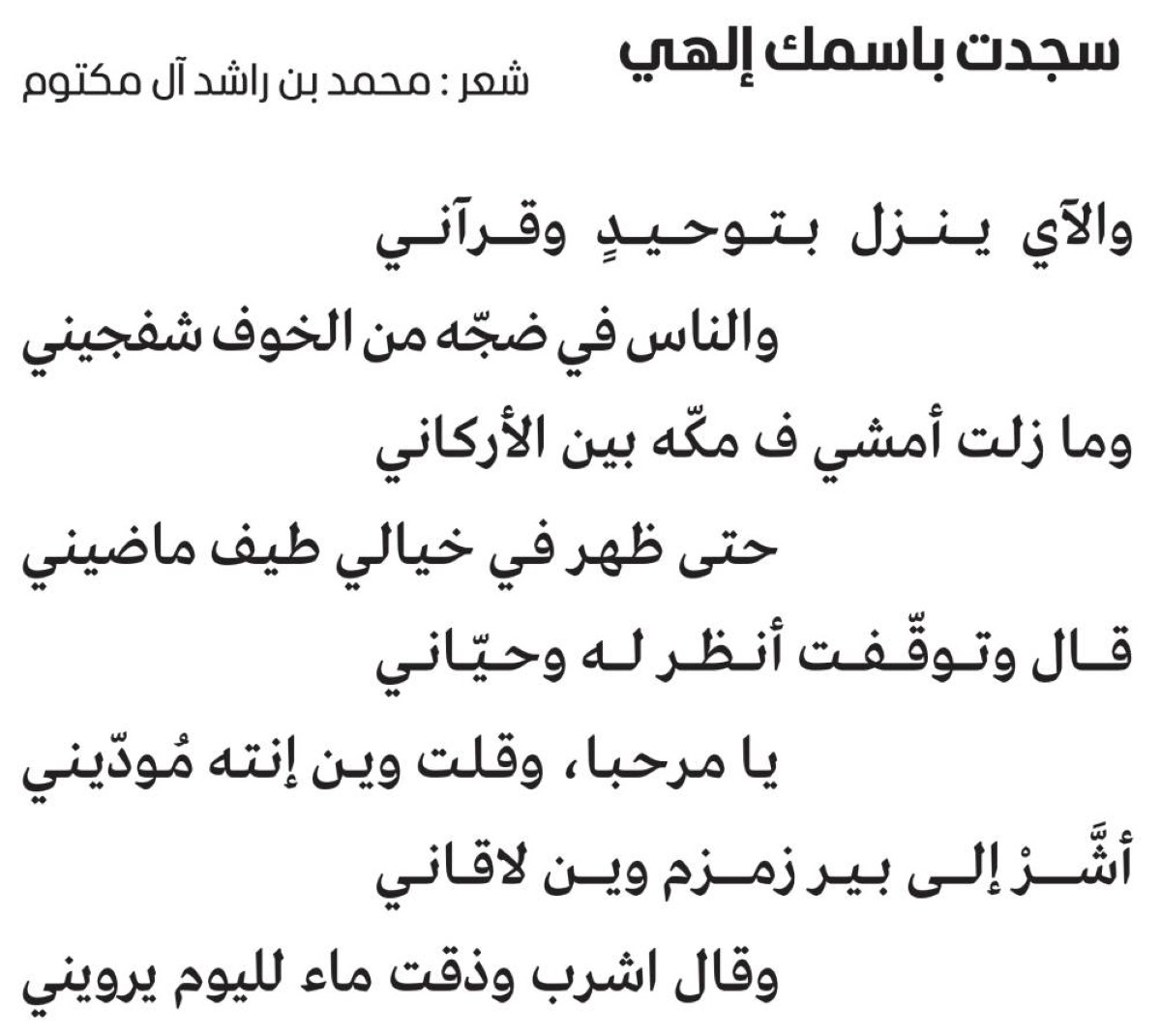 هذا هو القسم الثالث من قصيدة (سجدت باسمك إلهي عالي الشان)، حيث يواصل صاحب السمو الشيخ محمد بن راشد آل مكتوم، نائب رئيس الدولة، رئيس مجلس الوزراء، حاكم دبي، رعاه الله، الحديث عن مشاعر الخشوع وانشراح الصدر، وطواف الخيال في الماضي البعيد في عصر النبوة والصحابة الكرام وبدايات الإسلام العظيم، حيث كانت تتنزل آيات القرآن مشتملة على المطلب الأعظم ألا وهو توحيد الله تعالى، في بيئةٍ غلب عليها الشِّركُ والانحراف عن ملّة سيدنا إبراهيم، على نبينا وعليه الصلاة والسلام، بعد أن كانوا على الحنيفية السمحة، فاجتالتهم الشياطين حتى عبدوا أصنامًا صنعوها بأيديهم حين غابت عنهم عقولهم، فجاء القرآن الكريم فانتقل بالعرب من حضيض الشِّرك إلى ذُرى التوحيد، وأصبحوا بفضل هذا الدِّين خير أمّةٍ أُخرجت للناس، وكان البيتُ الحرام هو موطنُ الاجتماع الأكبر حيث يجتمع الملايين وتضجّ الأصوات بالدعاء، وفي هذا المقام الجليل عادت الذاكرة بصاحب السمو الشيخ محمد بن راشد إلى الماضي البعيد، وتراءى له طيفٌ جميلٌ ألقى عليه التحية، فردّ عليه بالترحيب ثم سأله إلى أين ستكون وجهته، فأشار إلى بئر زمزم المبارك، هذه البئر التي لها قدسيّة خاصة ، وفيها نوعٌ خاصٌّ من البركة تُقضى به الحاجات كما ثبت في الحديث عن سيّدنا رسول الله ــ صلى الله عليه وسلم ــ أنه قال: (ماءُ زمزم لِما شُرب له)، فكان ابن المبارك، رحمه الله، إذا اغترف منه ذكر هذا الحديث ثمّ قال: «اللهم إنّي أشربه لعطش يوم القيامة»، وكذا فعل كثيرٌ من العلماء والصالحين كانوا يتبرّكون بهذا الماء المبارك الذي شرب منه صاحب السمو الشيخ محمد بن راشد شربة ما زال يشعر بحلاوة طعمها، مع شعورٍ صادقٍ بالريّ لا يمكن له أن يذهب مع مرور الأيام، كلّ ذلك بسبب ما وضع الله تعالى في هذا الماء من أسرار الخير والبركة، لتظلّ مكّة هي مهوى الأفئدة وهي المدينة التي جعلها الله في وادٍ غير ذي زرع، لكنّ القلوب الصافية لا تزال تشعر بالحنين إليها، ومجاورة حرم الله بين ظهرانيها.