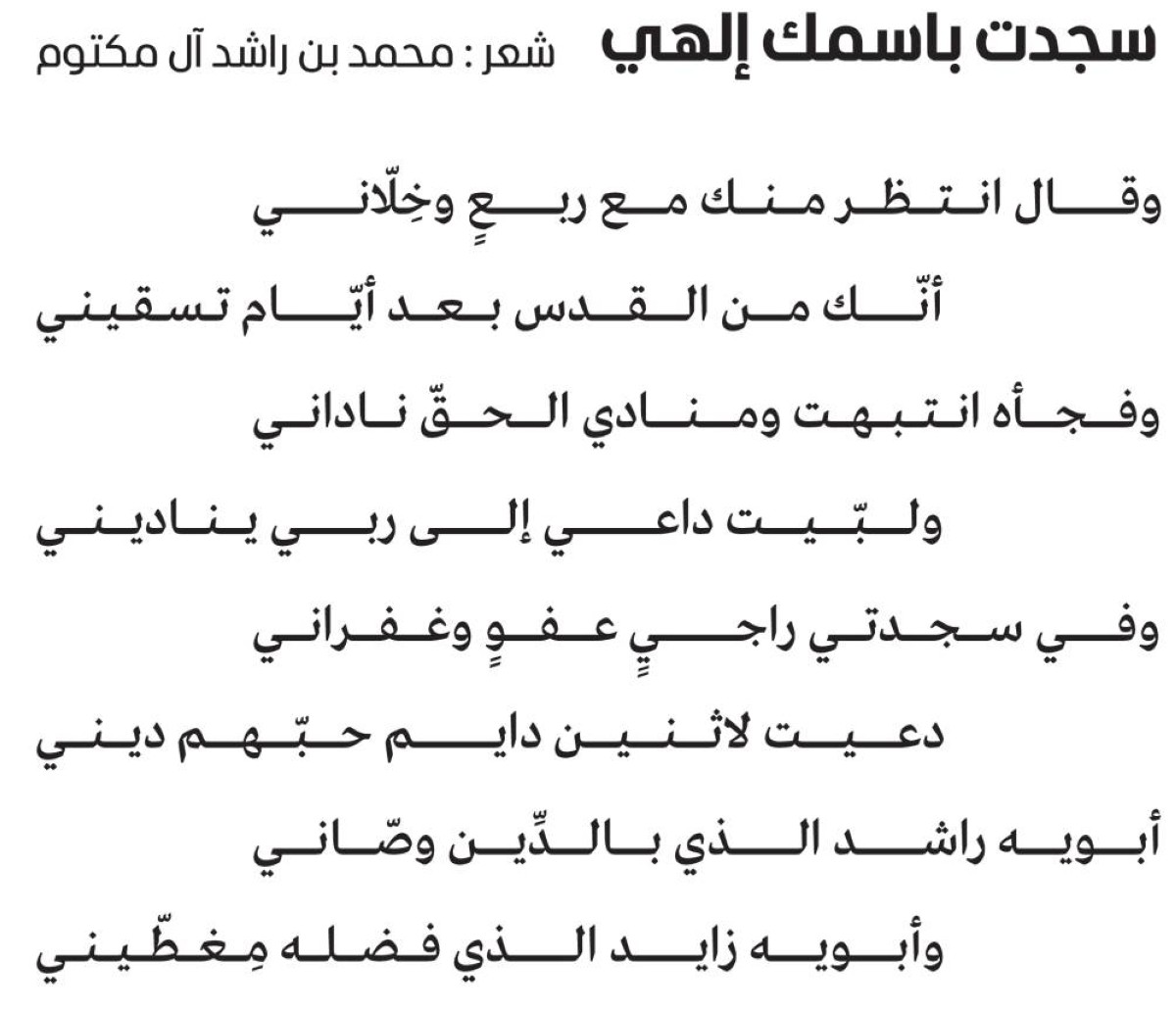وينتبه صاحب السموّ الشيخ محمد بن راشد في قصيدته بهذه اللحظة إلى صوت القلب الخفيّ الذي يدعوه إلى الحقّ تعالى كي يتشرّف بالسجود على باب عزّه وجلاله، حيث بادر إلى الامتثال، وشرّف وجهه بالسجود للكبير المتعالي، وقد امتلأ قلبه بالرجاء من أجل أن يفوز بالعفو والمغفرة في ذلك المقام العظيم في بلد الله الحرام، وحين استغرق سموه في لذّة السجود لم ينسَ اثنين؛ هما من أعزّ الناس على قلبه فدعا لهما، وترحّم على أرواحهما، أما أوّلهما فهو المغفور له طيّب الذكرى الشيخ راشد بن سعيد آل مكتوم، طيب الله ثراه، والد صاحب السموّ الشيخ محمد بن راشد ومعلّمه الأكبر الذي نهل من مدرسته أعمق دروس الحياة، واستفاد بكريم صحبته أشرف مناقب الفرسان، وغادر هذه الدنيا وهو يوصي صاحب السموّ الشيخ محمد بن راشد بالحفاظ على دينه، وأن يظلّ وفيّاً للمبادئ التي تعلّمها في مدرسة أبيه، وأما الآخر فهو طيّب الذكرى المغفور له الشيخ زايد بن سلطان آل نهيّان، طيب الله ثراه، الذي يذكره صاحب السموّ الشيخ محمد بن راشد بكل خير، ولا يكاد ينسى ذكره في ليلٍ أو نهار بسبب ما تلقّى منه من أخلاقٍ كريمة وشمائلَ شريفة كانت له خيرَ عونٍ في رحلته الكبيرة في بناء الحياة والإنسان.