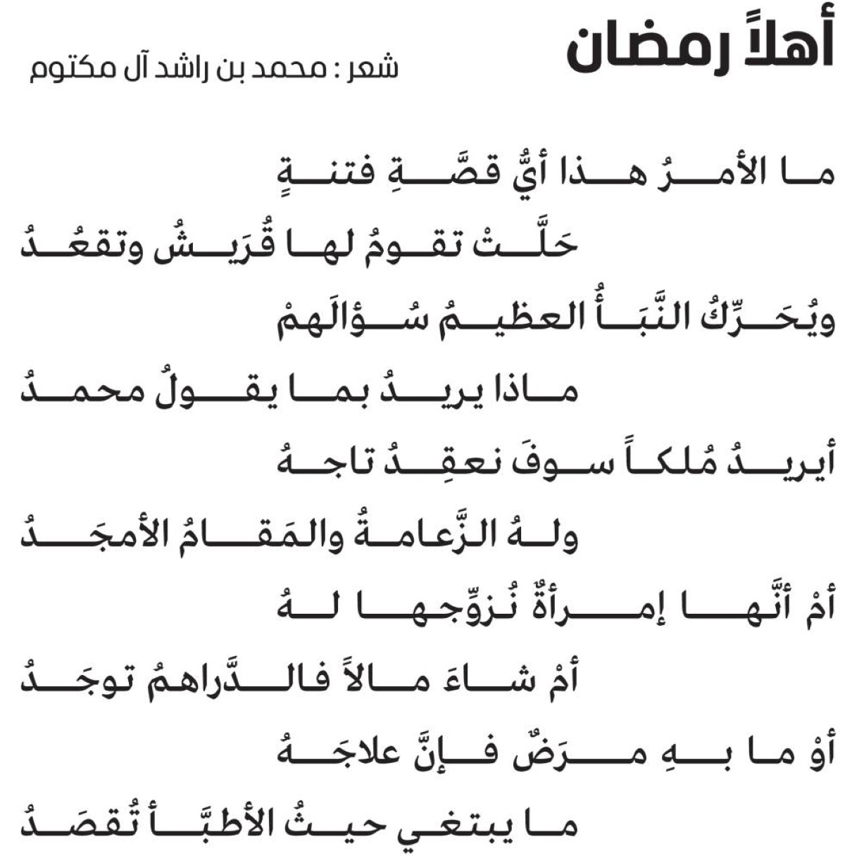 هذا هو القسم الثالث من قصيدة «أهلاً رمضان» التي كتبها صاحب السموّ الشيخ محمّد بن راشد آل مكتوم، نائب رئيس الدولة، رئيس مجلس الوزراء، حاكم دبيّ، رعاه الله، تعبيراً عن احتفائه بقدوم هذا الشهر الفضيل، حيث احتفى فيها بسيرة سيّد المرسلين، صلّى الله عليه وسلّم، فجاءت قصيدةً بديعة الشكل والمحتوى، حيث يرصد سموه في هذا المقطع الرائع طبيعة الضجيج الذي حصل في مكّة وبين ظَهرانَي قريش حين جاءهم هذا النبأ العظيم الذي هو القرآن الكريم، وأحدث حالة من الاضطراب الذي ظهر على ملامح رجالات قريش، وجعلهم يتساءلون عن مصدر هذا القلق الذي جعلوه فتنة تقوم لها قريش وتقعد تعبيراً عن عجزها وغيظها أمام هذا النُّور المنبثق من غار حراء، والذي بدأ يتسلّل إلى الأرواح، ويخلق معادلة جديدة للحياة، ممّا جعلهم يتساءلون عما يريد محمّد، صلّى الله عليه وسلم، بهذا النبأ العظيم الذي جاءهم به، وهو ما سجّله تعالى بقوله: {عمّ يتساءلون * عن النبأ العظيم * الذي هم فيه مختلفون}، ليندفعوا بعد ذلك في اقتراح مجموعة من الأسئلة والحلول الّتي تستنقذهم من هذا المأزق الروحي الجديد، فإذا كان رسول الله، صلّى الله عليه وسلّم، يريدُ الزعامة، فإنّهم سوف يعقدون له الزّعامة ويضعون على رأسه تاجها اللامع، وإذا كان يريد الزواج بامرأةٍ جميلة، فإنّهم على أتمّ استعداد لتزويجه بأجمل النساء ومن أشرف قبائل العرب، وإن كان يبتغي المال فهو حاضر عتيد، وإن كان يشكو من مرض وكان هذا الذي يأتيه من صنيع الجنّ، كما كانوا يعتقدون في كبرائهم، فإنهم سوف يبذلون كرائم أموالهم في سبيل شفائه والرجوع به إلى صحّة العقل والروح، ولكن رسول الله، صلّى الله عليه وسلّم، كان فوق ذلك كلّه، وكان في المحلّ الأعلى من الكمال الإنساني، ولذلك قال لهم بكل وضوح وصدق مخاطبّاً عمّه أبا طالب: «يا عمّ، والله لو وضعوا الشّمس في يميني، والقمر في يساري على أن أترك هذا الأمر ما تركته إلا أن يُظهره الله أو أهلِكَ دونه» صلّى الله عليه وسلّم.