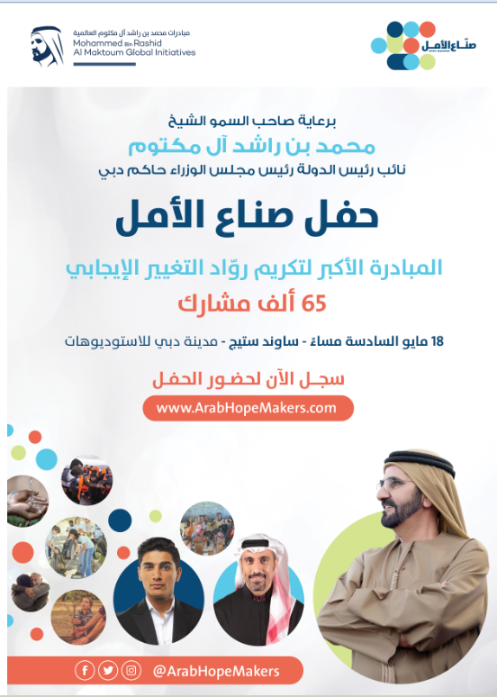أعلن صاحب السمو الشيخ محمد بن راشد آل مكتوم نائب رئيس الدولة رئيس مجلس الوزراء حاكم دبي، رعاه الله، عبر حساباته على وسائل التواصل الاجتماعي عن موعد الحفل الختامي لمبادرة "صنّاع الأمل" إحدى مبادرات محمد بن راشد آل مكتوم العالمية، في 18 مايو الجاري في قاعة "ساوند ستيج" بمدينة دبي للاستوديوهات. وتهدف المبادرة إلى إلقاء الضوء على ومضات الأمل المنتشرة في عالمنا العربي، وتكريمهم وتسليط الضوء عليهم وإبراز دورهم الفعّال في المجتمع في مختلف المجالات.