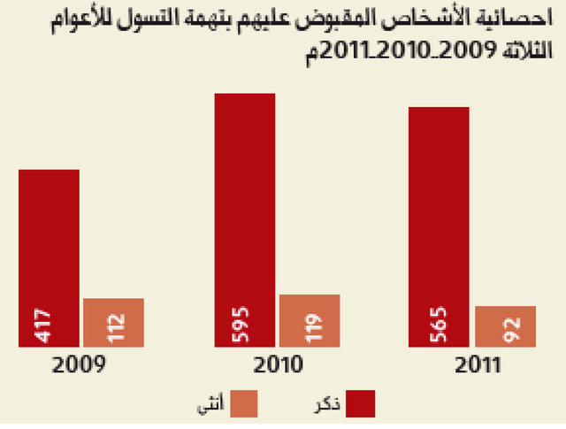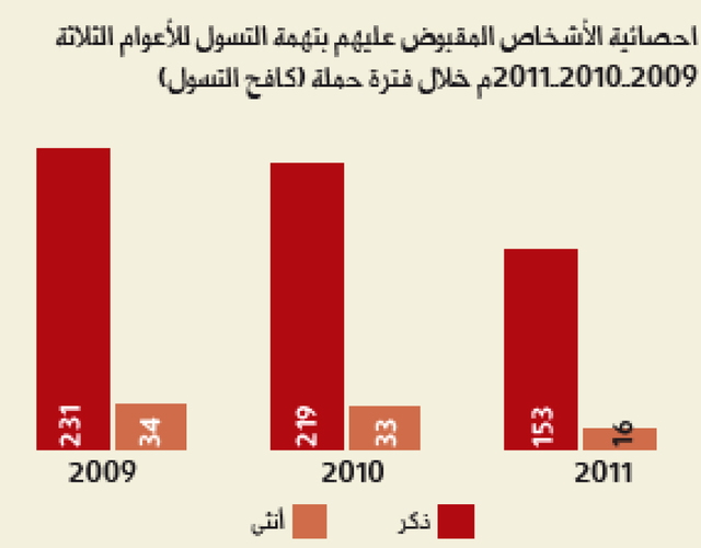 ضبطت القيادة العامة لشرطة دبي، 264 متسولا خلال الستة شهور الاولى بواقع 201 ذكر و63 إناثا، وضبط 1900 متسول من عام 2009 وحتى 2011، فيما اعدت 60 دورية لمراقبتهم خلال شهر رمضان على مدار الساعة.