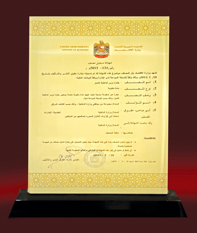 إلى ذلك تسلم الفريق سمو الشيخ سيف بن زايد آل نهيان شهادة الملكية الفكرية لنظام جائزة وزير الداخلية للتميز الصادرة من وزارة الاقتصاد.