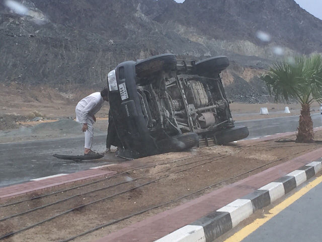 نجا سائق مواطن من حادث انقلاب سيارته ذات الدفع الرباعي ، على الشارع المحاذي لمركز أسنان الفجيرة، حيث فقد السائق السيطرة على مركبته اثناء انعطافه ، بسبب السرعة الزائدة ، نجم عنها انقلاب السيارة ، وخروج سائقها منها دون اية إصابات تذكر، ما عدا اضرار لحقت بهيكل السيارة الجانبي.
