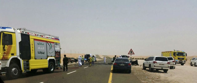 توفي خمسة مواطنين ، إثر حادث مروري مروع، وقع اليوم "السبت ، بمنطقة رزين في إمارة أبوظبي و أدى إلى احتراق احدى المركبات.