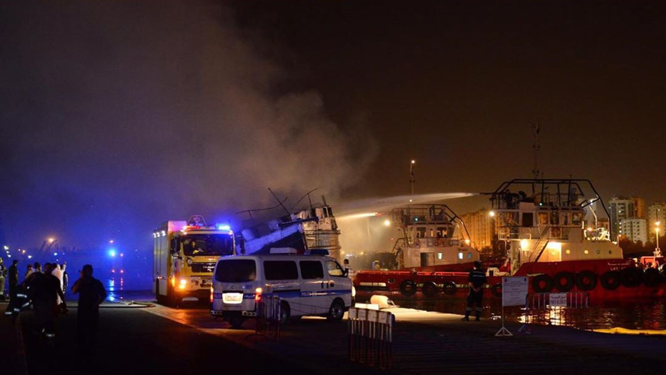 وتبين ان الحريق قد اندلع في مركب خشبي محمل بمجموعة كبيرة من السيارات السكراب وبراميل الديزل حيث باشرت الفرق المختصة عملياتها في أجلاء الأشخاص المتواجدين بالموقع وتأمين سلامتهم، وإطفاء الحريق الذي لم تستغرق عملية إطفائه سوى وقت قصير، مما أدى للسيطرة في عدم انتقال آثاره لمراكب أخرى وتبعه عمليات التبريد ما أدى الى انبعاث سحابة كثيفة من الدخان نتيجة احتراق المركبات وعبوات الديزل دون وقوع أي إصابات بين الأشخاص.