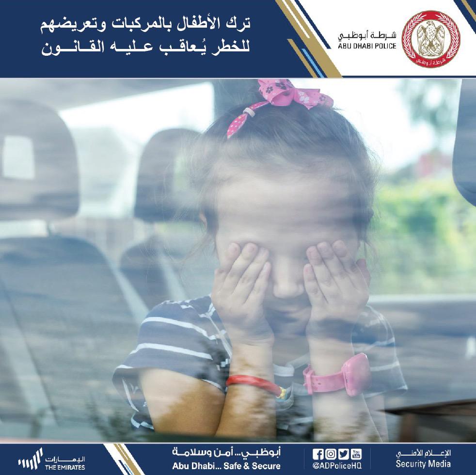 أكدت شرطة أبوظبي أن ترك الأطفال داخل المركبات بمفردهم أثناء التسوق أو لأي سبب آخر وتعريض حياتهم للخطر يُعد جريمة يُعاقب عليها القانون وسوف يتم إحالة كل من يثبت إهماله في مثل هذه الحالات إلى الجهات القضائية لاتخاذ الإجراءات القانونية بحقهم.