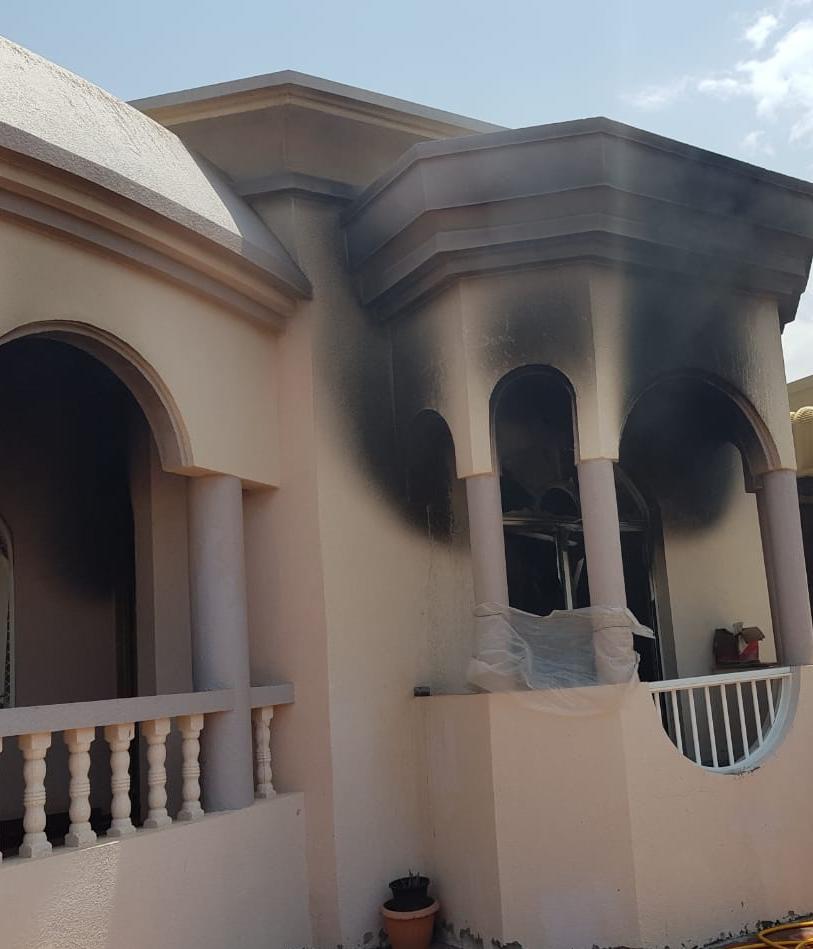 تلقت غرفة عمليات الدفاع المدني بالفجيرة بلاغا بتمام الساعة 12:20 ظهرا يفيد باحتراق منزل في منطقة البدية مع شخص مفقود ، وعلى فور البلاغ تم تحريك مركز الاختصاص/ مركز الدفاع المدني ضدنا لموقع البلاغ وعند الوصول تمت عملية البحث والتفقد وإخراج المحصور وهو بصحة جيده وتم تسليمه للإسعاف الوطني دون أية إصابات ولله الحمد ، وتم إخماد النيران والسيطرة على الحريق وإخلاء المنزل وتبريد الموقع وتسليمه للجهات المختصة في الإمارة، لاستكمال الإجراءات اللازمة ، ونتج عن الحادث احتراق غرفة نوم وصالة و تلوث المنزل بالدخان.