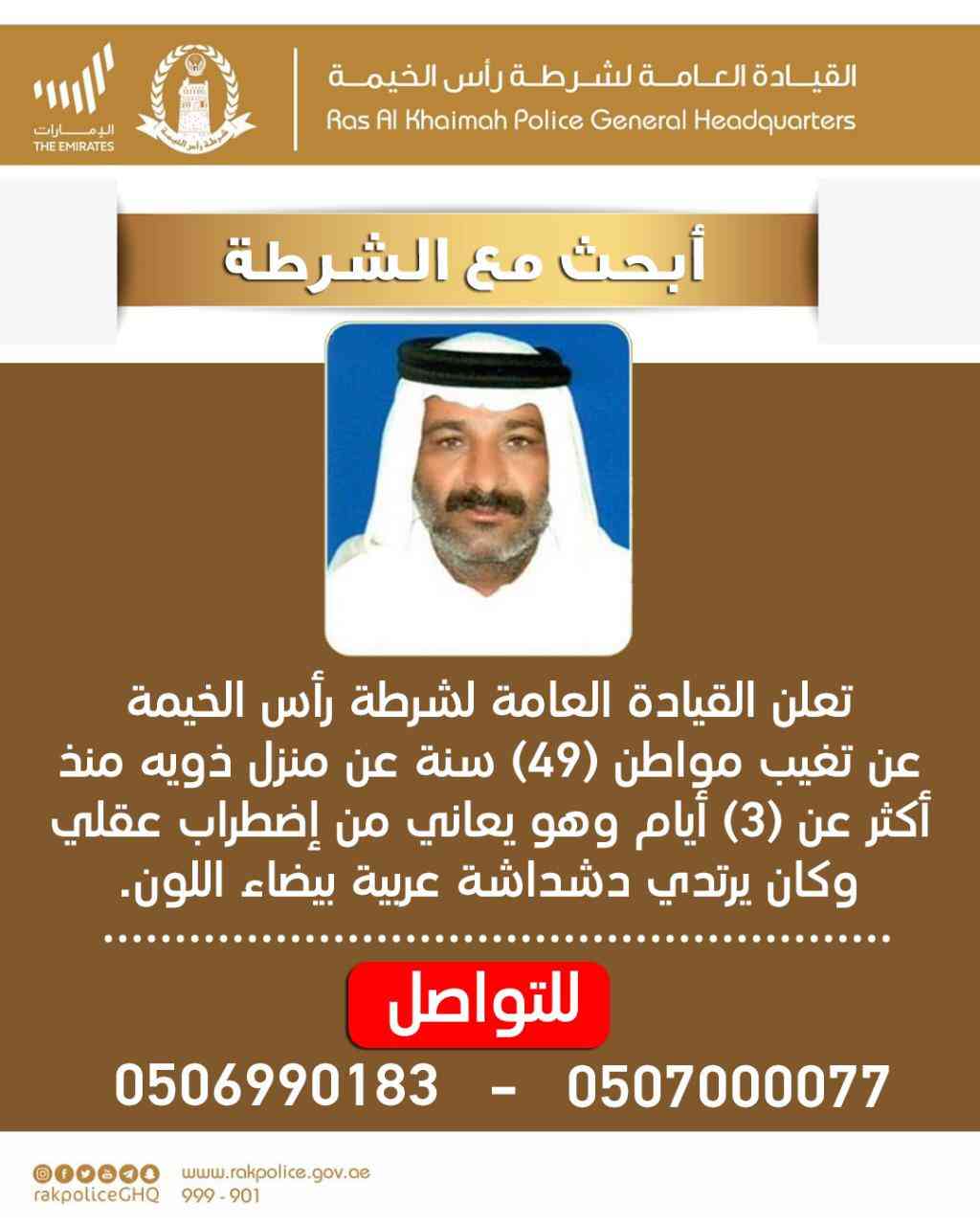 ودعت شرطة رأس الخيمة منطقة الاختصاص التي يقطن فيها ذوو المتغيب من يتوصل إلى أية معلومة تفيد بالعثور عليه إلى إبلاغ الشرطة أو الاتصال بغرفة عمليات شرطة رأس الخيمة على الأرقام (999 أو 901)، أو الاتصال على الأرقام التالية 0506900183 أو 0507000077.