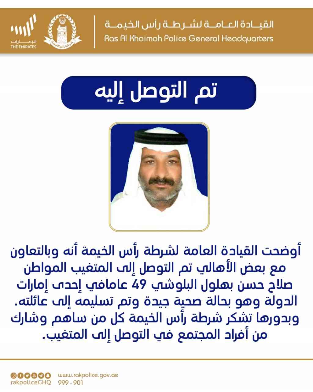 أوضحت القيادة العامة لشرطة رأس الخيمة أنه وبالتعاون مع بعض الأهالي تم التوصل إلى المتغيب المواطن صلاح حسن بهلول البلوشي 49 عاماً في إحدى إمارات الدولة وهو بحالة صحية جيدة وتم تسليمه إلى عائلته.