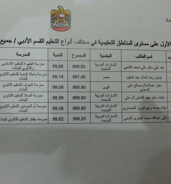 - الطالبة الإماراتية سارة عبد الرحمن أحمد محمد الأنصاري من مدرسة أسماء بنت النعمان النموذجية (دبي) على المركز الأول بمعدل تفوق بلغ 99.88 %.