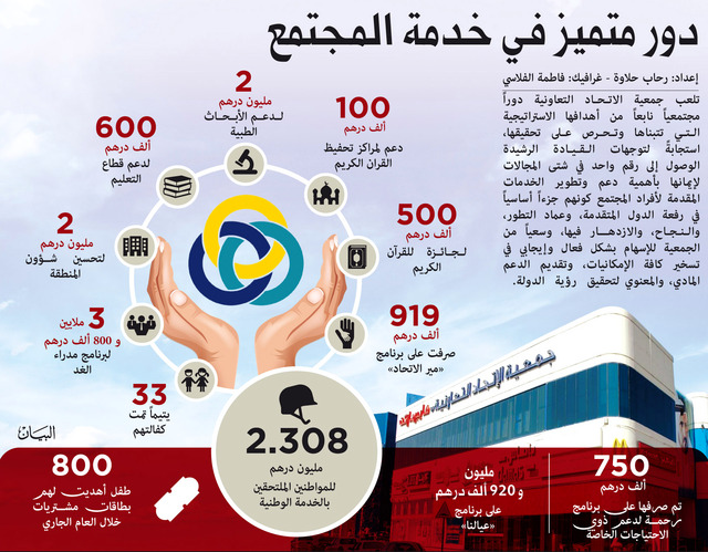 وقال: صرفت جمعية الاتحاد التعاونية هذا العام نحو 17 مليونا و186 ألفا و118 درهما على مذكرات التفاهم التي أبرمتها مع الجهات الأخرى موزع] كما يلي: مليونا درهم لمؤسسة الجليلة لدعم التعليم والأبحاث في المجالات الطبية، وذلك حسب مذكرة التفاهم الموقعة بين الطرفين في عام 2014، التي تنص على دعم المؤسسة بمبلغ 10 ملايين درهم خلال 5 سنوات، حيث تم صرف دفعه عن العام الماضي بقيمة مليوني درهم، ودفعة عن العام الجاري بقيمة مليوني درهم، كما سيتم صرف المبلغ المتبقي وقيمته 6 ملايين درهم خلال السنوات الثلاث المقبلة.