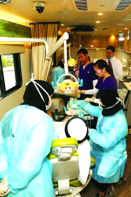 وتضم عيادة الأسنان المتنقلة التي تقدم خدماتها كاملة بالمجان، والتي تعتبر الأكبر في المنطقة، 3 كراسي حديثة للعلاج، ومعدات طبية متكاملة، كما تضم أماكن انتظار تحتوي على أجهزة ذكية. ويمكن أن تمتد العيادة أكثر من مساحتها الكاملة والتي تساوي 13 متراً طولاً و4 أمتار عرضاً، يرافق العيادةَ طاقمٌ طبي يضم 4 طبيبات مواطنات من خريجات كلية طب الأسنان بجامعة الشارقة وممرضتين الى جانب طبيب اختصاصي لعلاج الحالات الخاصة. وتتوفر في العيادة المتنقلة أقصى درجات الأمن والسلامة أثناء السير وخلال ساعات العلاج.