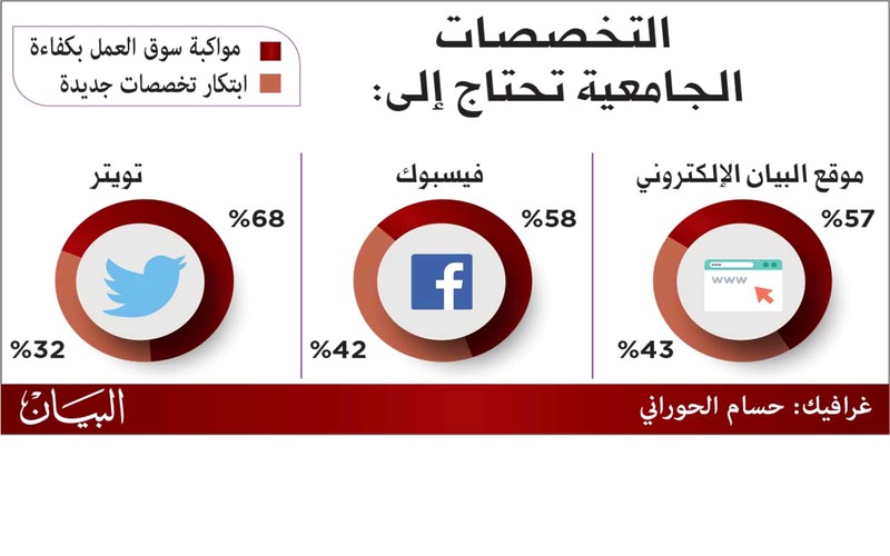 وجاء في نتيجة الاستطلاع على موقع «البيان» الإلكتروني أن 57 % يؤكدون أن التخصصات الجامعية تواكب سوق العمل بكفاءة، و43% وجدوها تحتاج إلى ابتكار تخصصات جديدة، أما على موقع التواصل الاجتماعي في «تويتر»، جاء عدد المستطلع آرائهم كالآتي: 68% من المصوتين يجدونها مواكبة بكفاءة، بينما أجاب نحو 32% أن التخصصات الجامعية تحتاج إلى ابتكار تخصصات جديدة، وجاءت نتائج «الفيسبوك» لتؤكد أن 58% من تلك التخصصات الجامعية المطروحة أمام الطلبة مواكبة لسوق العمل و 42% أجابوا بأنها تحتاج إلى ابتكار تخصصات جديدة.