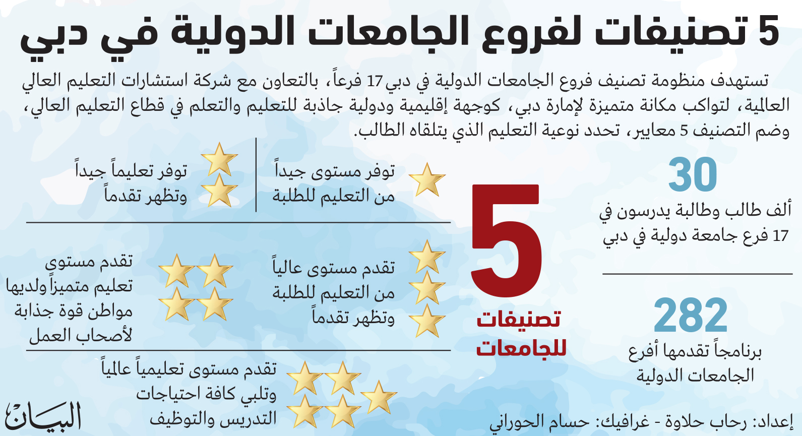 وإلى ذلك، فقد تم تطوير منظومة تصنيف فروع الجامعات الدولية بالتعاون مع شركة استشارات التعليم العالي العالمية، كما تمت مواءمتها محلياً بما يلبي احتياجات فروع الجامعات الدولية في دبي، وبما يواكب مكانة متميزة لإمارة دبي كوجهة إقليمية ودولية جاذبة للتعليم.