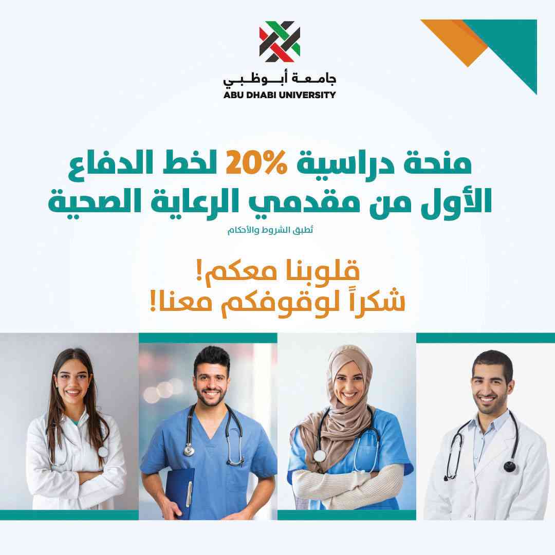 أعلنت جامعة أبوظبي عن تخصيص منحة دراسية قدرها 20% لخط الدفاع الأول من مقدمي الرعاية الصحية لهم ولأزواجهم وأولادهم وذلك تقديراً لجهودهم الرائدة في تحقيق الأمن والسلامة خلال جائحة «كوفيد 19»، وتشمل المنحة الدراسية الراغبين في الحصول على شهادات البكالوريوس والدراسات العليا ضمن أكثر من 50 برنامجاً دراسياً من الفصل الدراسي الأول من العام الأكاديمي 2020-2021 في فروع الجامعة في أبوظبي والعين ودبي والظفرة، وتأتي هذه المنحة الدراسية ضمن مبادرات الجامعة الداعمة لمقدمي الرعاية الصحيّة، والتي تضمنت تزويد مستشفيات في أبوظبي واقياً طبياً للوجه.