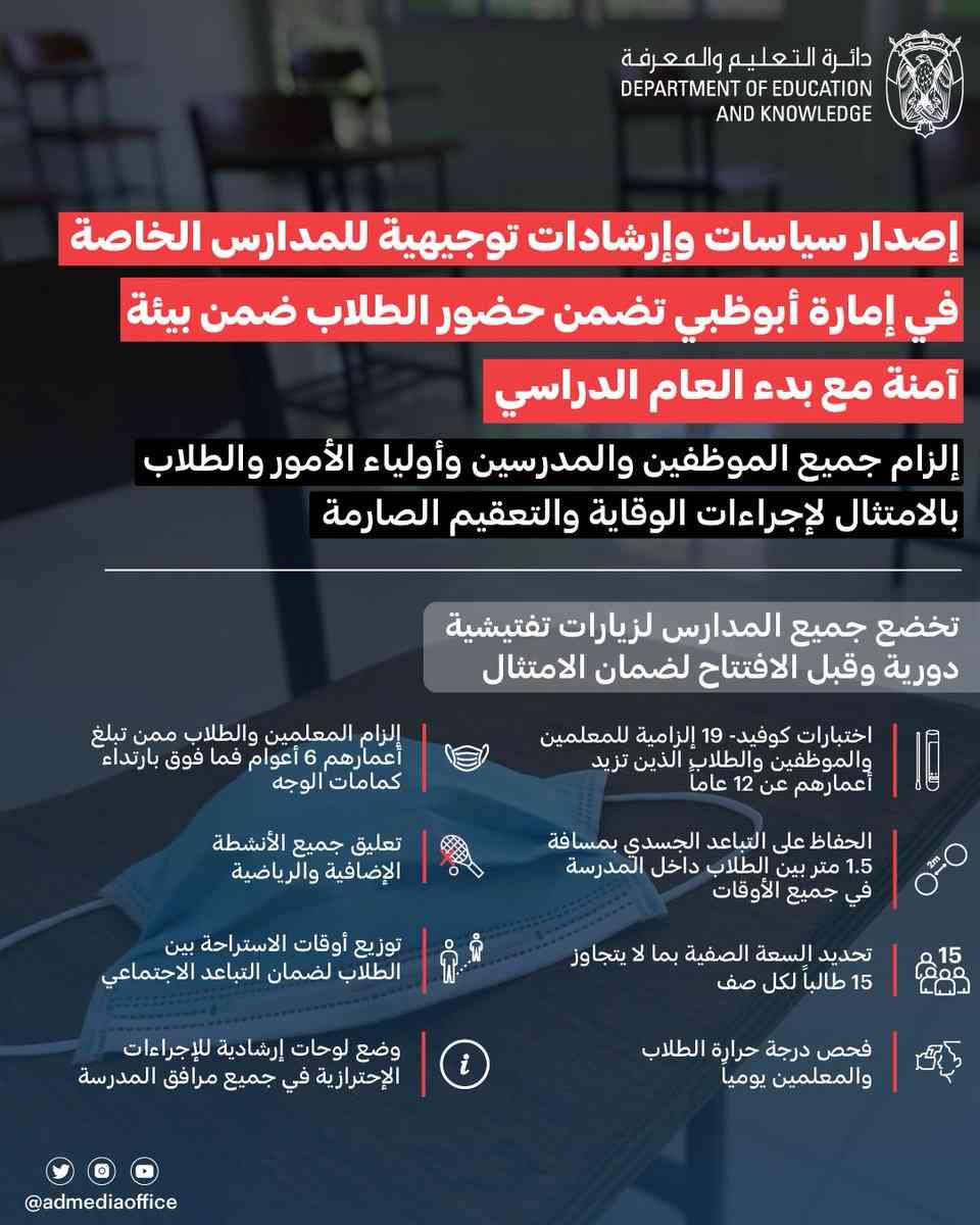 ومع بداية إعادة فتح المدارس ستعمل دائرة التعليم والمعرفة وبالتنسيق مع المدارس على إجراء فحوصات "كوفيد -19 " لأعضاء الكادر التعليمي والإداري وجميع الطلاب فوق 12 سنة.