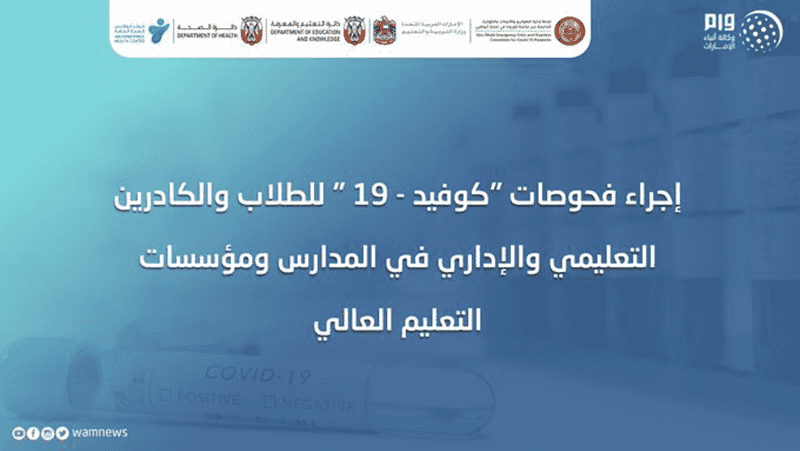 في إطار خطط إعادة فتح المدارس والكليات، سيتم إجراء فحوصات كوفيد-19 " للكادرين التعليمي والإداري وجميع الطلاب فوق 12 عاماً، تشمل المدارس الحكومية والخاصة ومؤسسات التعليم العالي بأبوظبي.
