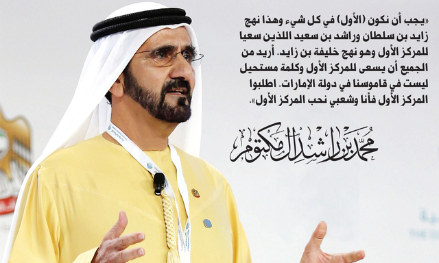 «يجب أن نكون (الأول) في كل شيء وهذا نهج زايد بن سلطان وراشد بن سعيد اللذين سعيا للمركز الأول وهو نهج خليفة بن زايد. أريد من الجميع أن يسعى للمركز الأول وكلمة مستحيل ليست في قاموسنا في دولة الإمارات. اطلبوا المركز الأول فأنا وشعبي نحب المركز الأول».