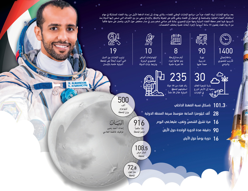 ساعات قليلة ويسجل التاريخ الإماراتي نجاحاً آخر لـ«عيال زايد» يحمل أحلام مؤسسيها وقادتها وشعبها إلى عالم الفضاء الحقيقي، فيما يحمل الراية هذه المرة ابن الإمارات البار هزاع المنصوري، أول رائد فضاء عربي ينطلق إلى محطة الفضاء الدولية.
