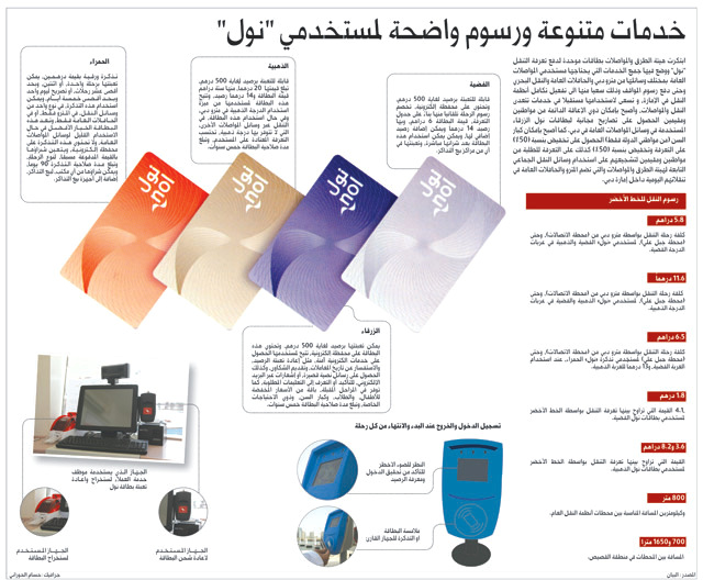 فعلت هيئة الطرق والمواصلات أمس خدمة الاشتراك الشهري في بطاقة نول الزرقاء، بالتزامن مع إعادة تقسيم مناطق دبي لتصبح 7 مناطق بدلاً من 5، وذلك نتيجة للتوسع في المناطق التي يخدمها المترو مع تشغيل الخط الأخضر، وتدشين خطوط جديدة لحافلات المواصلات العامة، وقد بلغ عدد بطاقات تعرفة التنقل في دبي "نول" التي تم بيعها منذ تشغيل مترو دبي في سبتمبر 2009، وحتى منتصف العام الجاري أكثر من 3 ملايين بطاقة، وتعد البطاقة الفضية هي الأكثر مبيعاً، حيث يتم بيع ما يقارب 3 آلاف بطاقة يومياً.