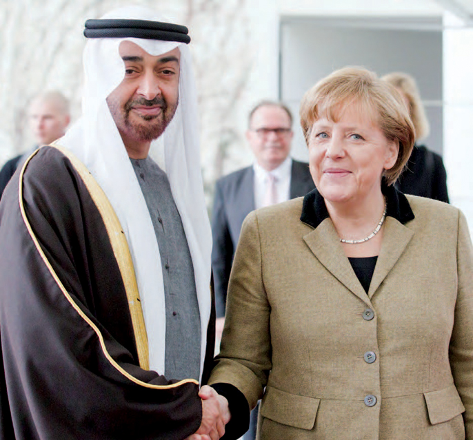 أجرى الفريق أول سمو الشيخ محمد بن زايد آل نهيان ولي عهد أبوظبي نائب القائد الأعلى للقوات المسلحة مباحثات مع انجيلا ميركل المستشارة الألمانية تركزت حول سبل تعزيز العلاقات الثنائية والمصالح المشتركة بين البلدين والشعبين الصديقين.