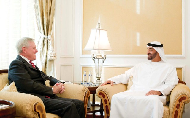 استقبل الفريق أول سمو الشيخ محمد بن زايد آل نهيان ولي عهد أبوظبي نائب القائد الأعلى للقوات المسلحة مساء أمس بقصر البطين راي مابوس وزير البحرية الأميركي الذي يزور البلاد حالياً.