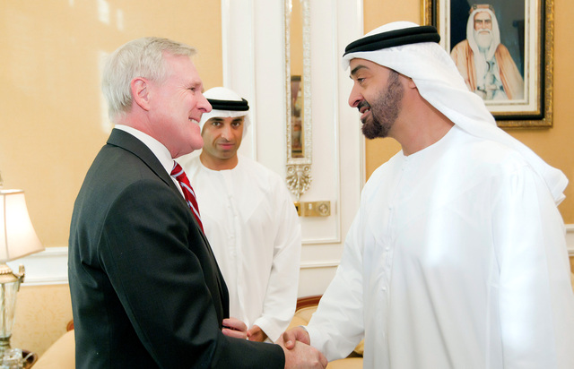 ورحب سمو ولي عهد أبوظبي بالوزير والوفد المرافق له، مشيداً سموه بتطور علاقات الصداقة القائمة بين دولة الإمارات والولايات المتحدة الأميركية وحرص البلدين على تنمية روابط التعاون بما يخدم المصلحة المشتركة.
