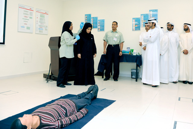 والتقى عدداً من المتدربين من طلبة المدارس ومن جهات حكومية محلية واتحادية، يتلقون دورات تدريبية عملية ونظرية على الإسعافات الأولية وحضر سموه في قاعات التدريب جانباً من المحاضرات التي يلقيها متخصصون في مجال الإسعاف.