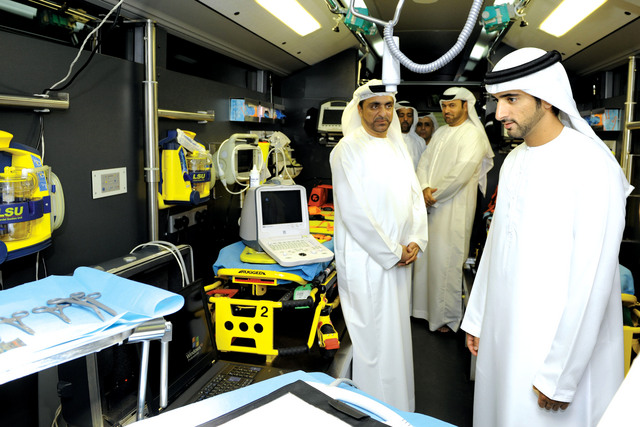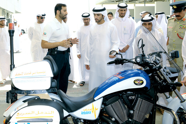 واطلع سمو الشيخ حمدان بن محمد بن راشد آل مكتوم، كذلك على مجموعة من سيارات الإسعاف المجهزة خصيصاً للإسعاف البري، حيث تستطيع هذه السيارات ومعها دراجات نارية أن تصل إلى عمق الصحراء تلبية لأي نداء يصل إلى غرفة العمليات بهذا الخصوص.