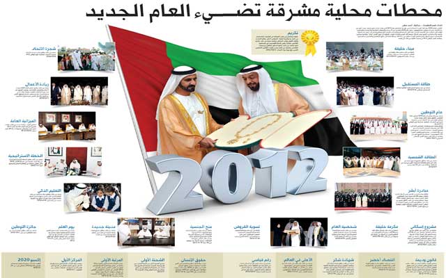 عام حافل من العطاءات اللامحدودة التي عودنا صاحب السمو الشيخ خليفة بن زايد آل نهيان رئيس الدولة، حفظه الله، على التكرم بها على أبنائه المواطنين. فمن مبادرات سموه لتطوير وتحديث الطرقات ومنح المساكن للمواطنين وإصدار سموه عفواً سامياً وتسديده لديون المعسورين ليبدؤوا حياتهم من جديد لقيادة سموه وبخطى واثقة في مسيرة التمكين نحو بر الأمان، وليتوج صاحب السمو رئيس الدولة عطاءاته خلال 2012 بإطلاق مبادرة "أبشر" لتوظيف 20 ألف مواطن خلال السنوات الخمس المقبلة في القطاعين العام والخاص.