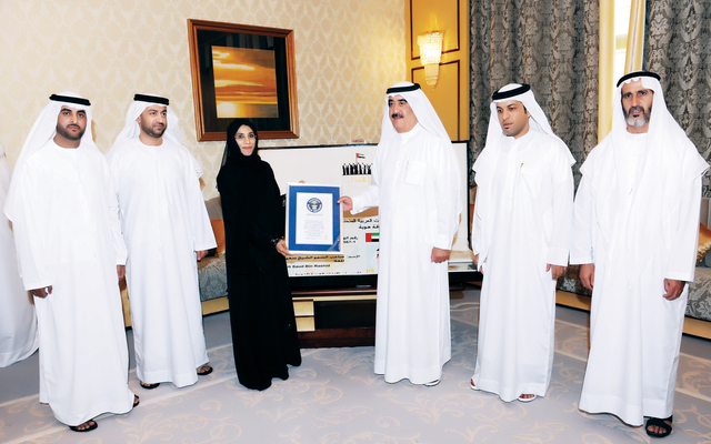 تسلم صاحب السمو الشيخ سعود بن راشد المعلا عضو المجلس الأعلى حاكم أم القيوين في الديوان الأميري بحضور سمو الشيخ راشد بن سعود بن راشد المعلا ولي عهد أم القيوين أكبر بطاقة هوية تحمل اسم سموه ضمن فعالية أكبر هوية وطنية في إطار مشروع " خليفة بلغات العالم " الذي أطلقه مركز سلطان بن زايد للثقافة والإعلام وتم تسجيلها في موسوعة جينيس للأرقام القياسية.